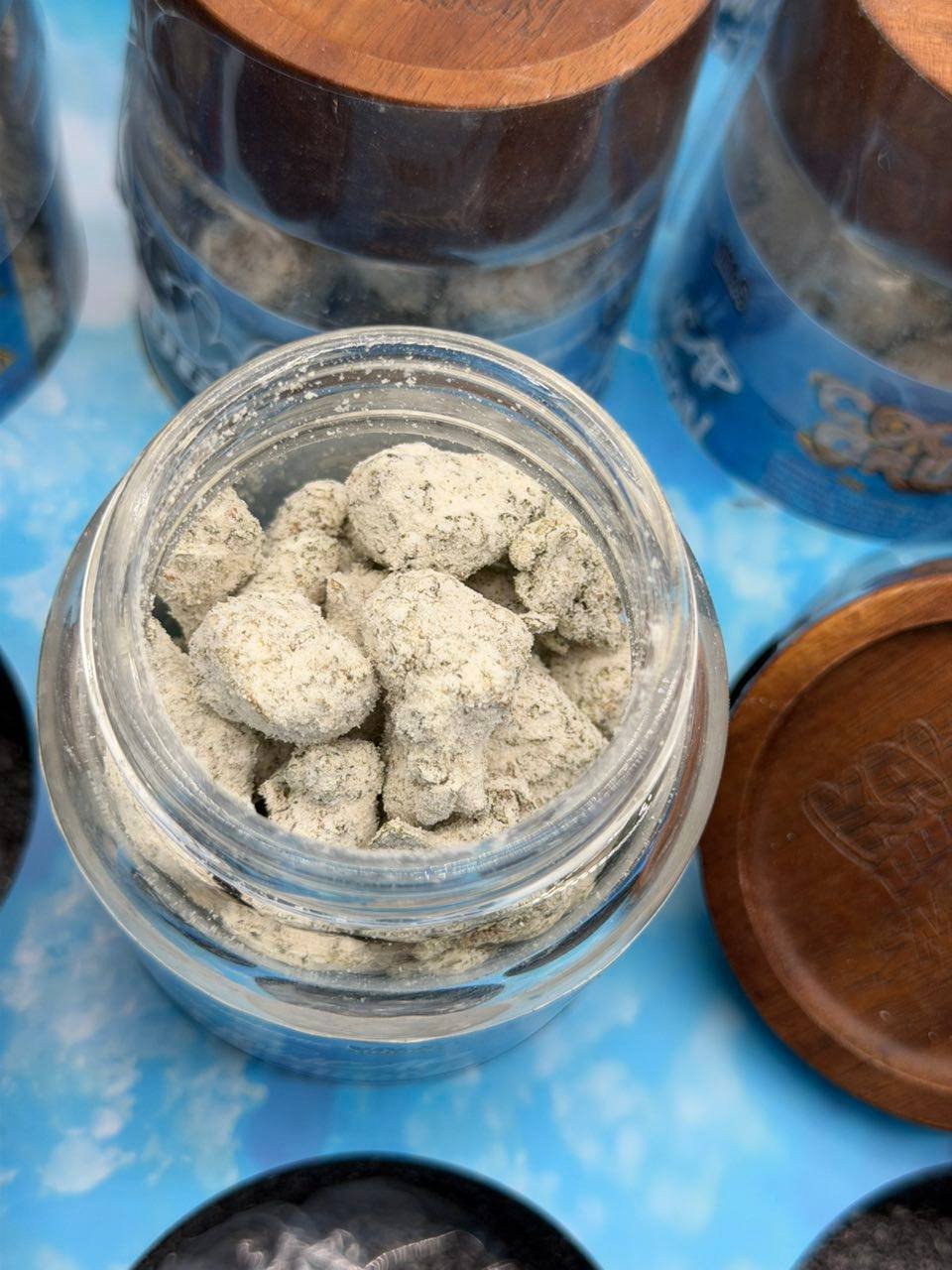 The Kaws Rocks Snowcap Edition is defined by its exceptional purity and potency. Beginning with hand-selected exotic indoor flower, each bud is meticulously coated in 99.9% pure THCA diamond powder and then generously layered with THCA diamond flower. This creates a frosty, visually stunning cannabis product that’s as potent as it is beautiful. The unique process ensures that every Kaws Rocks delivers a consistently powerful effect, distinguishing the Snowcap Edition from standard moon rocks.