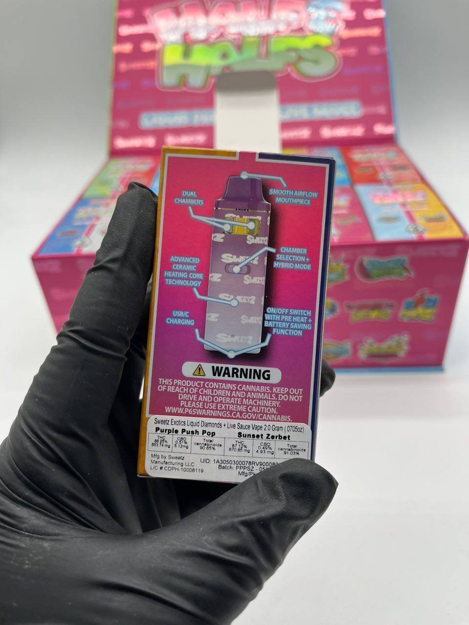 Sweetz Exotics disposable 2g vapes boast a combination of liquid diamonds and live resin, two of the most sought-after cannabis extracts. Liquid diamonds provide exceptional potency and purity, while live resin preserves the full spectrum of terpenes from the cannabis plant, ensuring a rich terpene profile and flavorful vaping experience. This combination makes Sweetz 2g disposable vapes a top choice for cannabis connoisseurs.